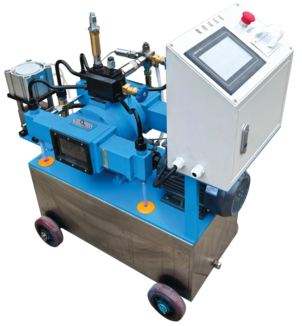 压力试验前,可先在触摸控制屏上设定打压压力及保压时间。在触控屏上点击开始按钮,试压泵开始工作,随着压力上升,达到指定压力时自动停止,进入保压状态。达到保压时间后,触摸屏上的保压时间分区会变红提醒,可选择手动泄压或者气控阀自动泄压,试验完成后,用微型打印机打印出试压曲线。